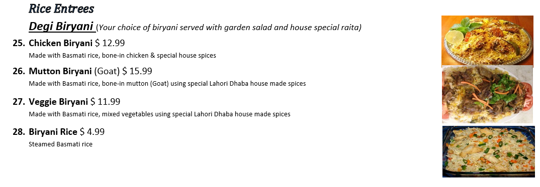 Starters         Vegetarian Delights           Rice Entrees           Bar-B-Que          Karahi Specials           Masala & Curries          Sides