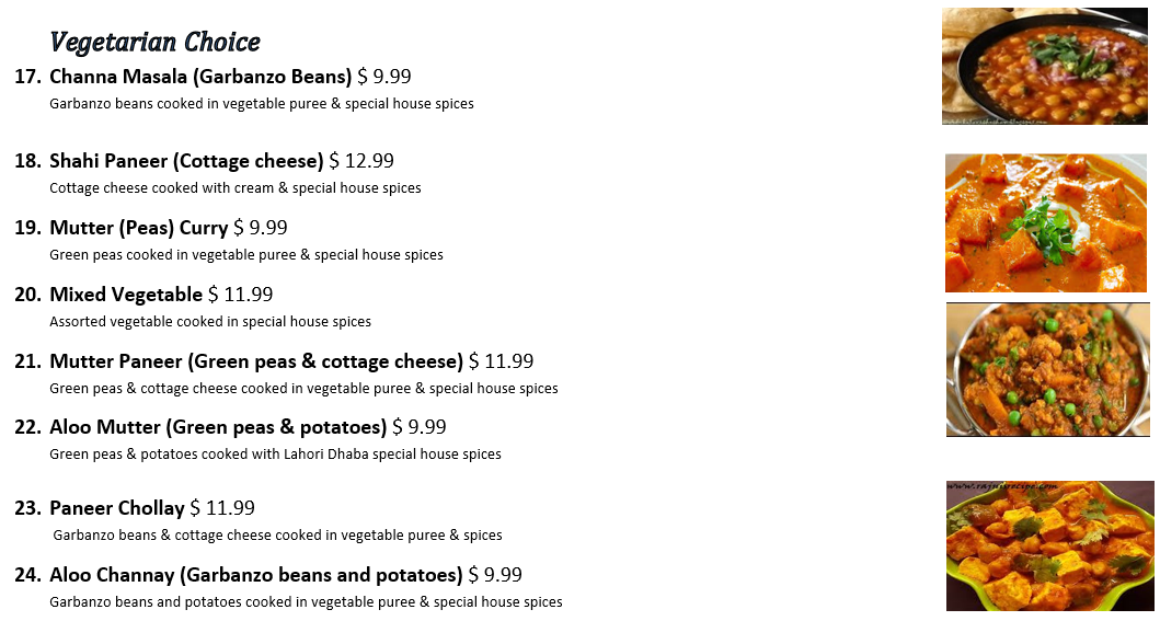 Starters           Vegetarian Delights           Rice Entrees           Bar-B-Que          Karahi Specials           Masala & Curries          Sides