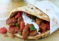 Wheat flour tortilla filled with Seekh Kabab of ground beef +fresh vegie salad, served with mint sauce.